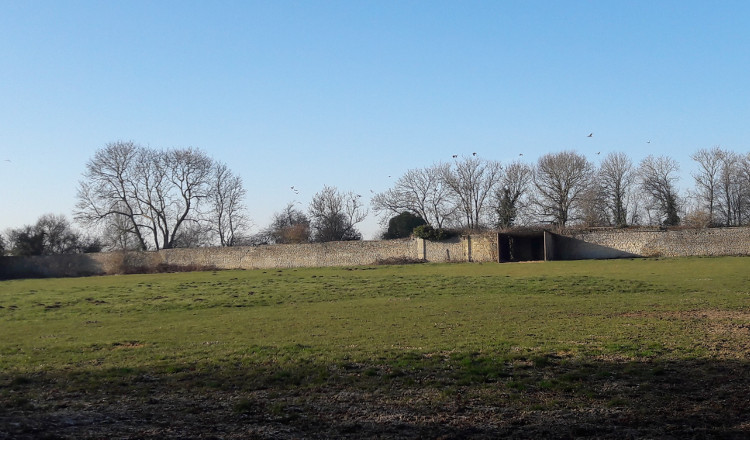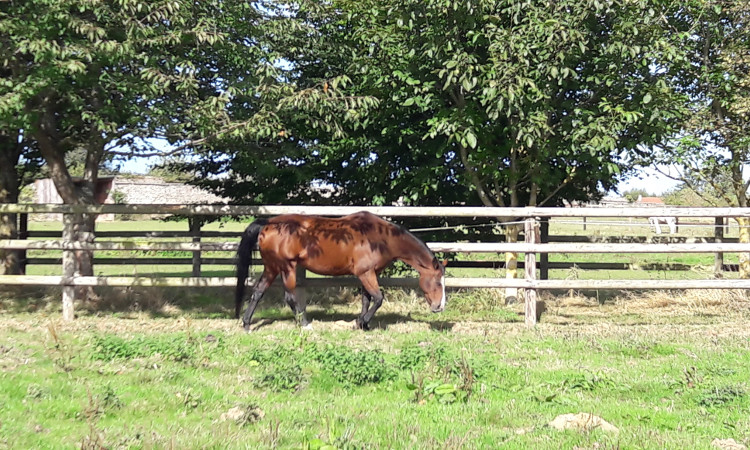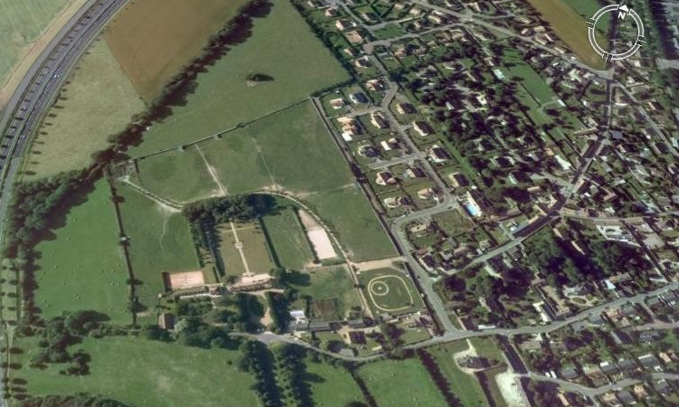 Six paddocks de 3 à 7000 m2 en herbe fermés par des lisses en bois créasoté et bordés de murs.